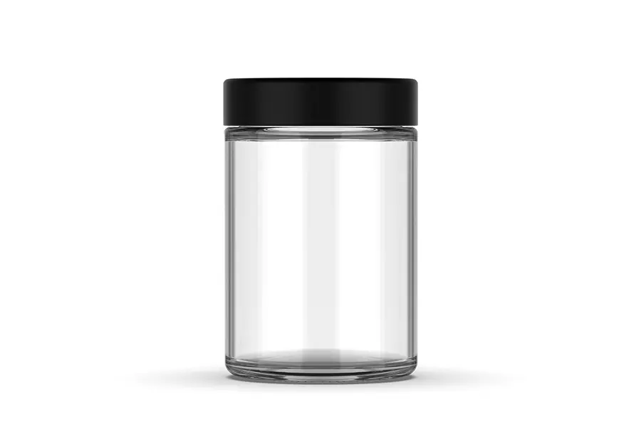 Premium 5oz clear glass jar designed for cannabis flower storage with child-resistant functionality and strong branding flexibility.