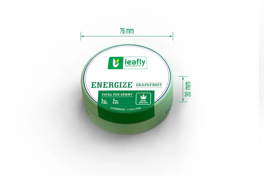 This LeaflyPackaging branded circular tin container is a premium packaging solution designed specifically for the cannabis industry. Measuring 76mm in diameter and 30mm in height, this sturdy tin features custom printing with the LeaflyPackaging brand identity and product information. The container is ideal for packaging gummies, edibles, or other cannabis products, providing reliable protection and professional presentation.