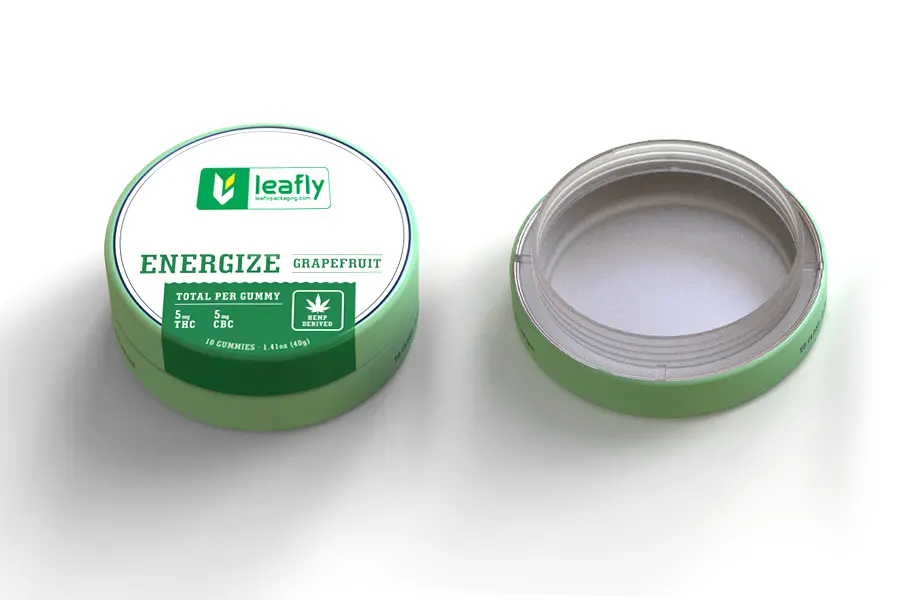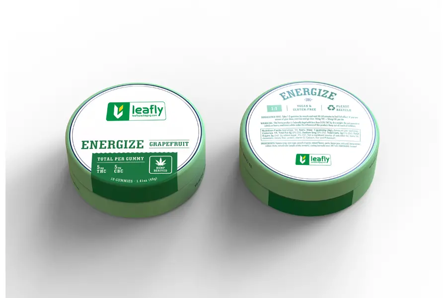 High-Quality Custom Printing: Features crisp, durable printing with the LeaflyPackaging brand logo, product name "ENERGIZE GRAPEFRUIT", and all required regulatory information including cannabinoid content details.
