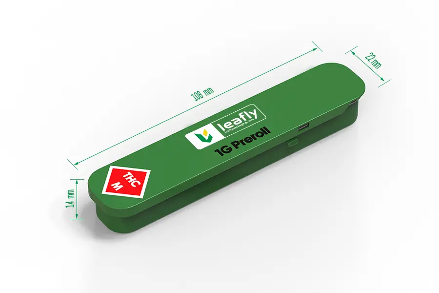 Introducing the LKS-WYX-SRE108 pre-roll case, specifically designed for storing and transporting Leafly 1G prerolls. This sleek green rectangular case (108×22×14mm) features a child-resistant closure and discreet branding, making it an ideal compliant packaging solution for cannabis products. The compact design ensures easy portability while providing secure storage for your pre-rolls.